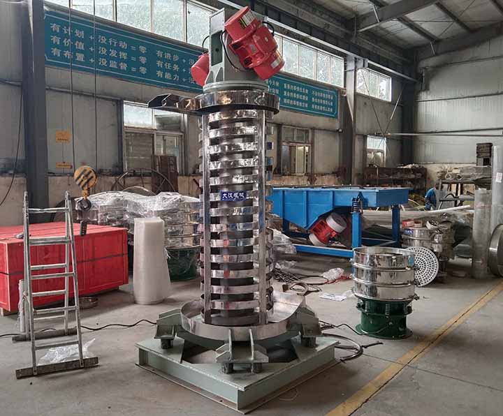 垂直振動提升機不同于斗式提升機,它是安裝在輸送塔底部的兩臺振動電機工作的,兩臺振動電機交叉安裝,產生激振力,強迫整個輸送塔體作水平圓運動和向上垂直運動的空間復合振動,螺旋槽內的物料則受輸送槽的作用,作勻速拋擲圓運動,沿輸送槽體向上運動,從而完成物料的向上(或向下)輸送作業。常用于礦山、冶金、機械、建材、化工、橡膠、醫藥、電力、糧食、食品等行業的塊狀、粉狀和短纖維狀固體物料的提升。